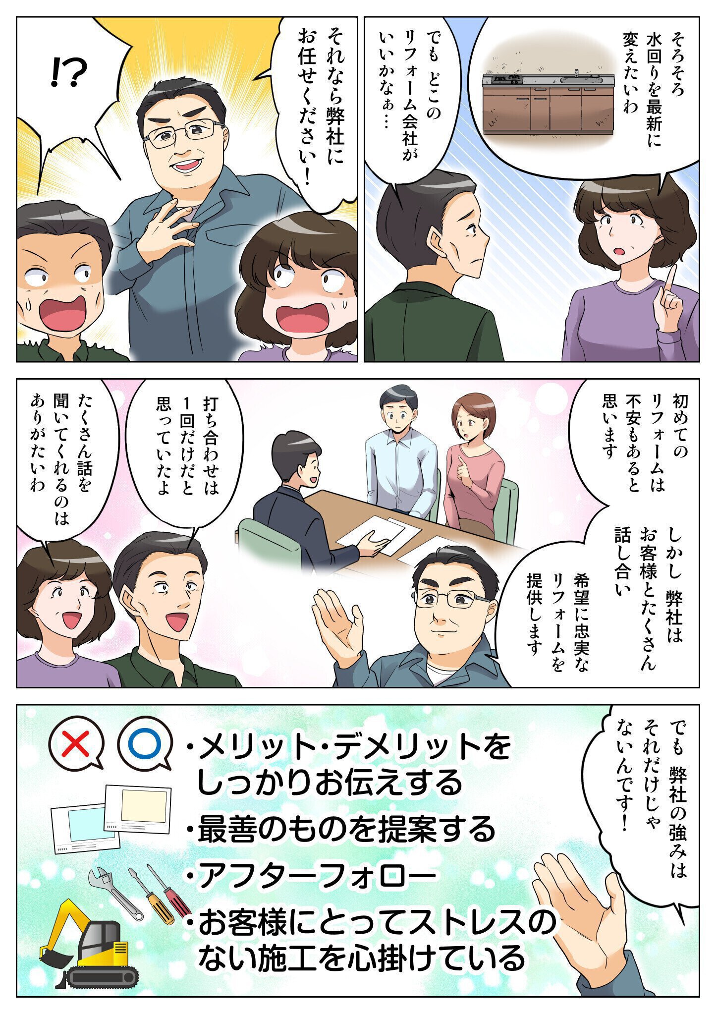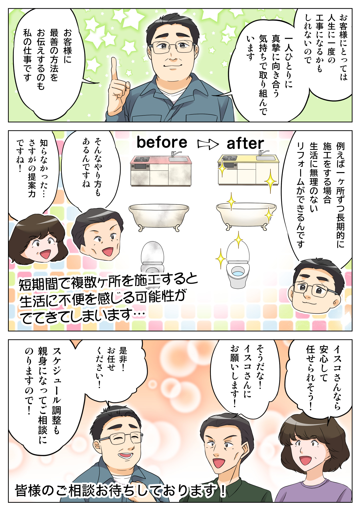 言われた通りの施工をするだけでは、プロとはいえません。お客様のご要望、周辺環境や施工箇所の状況、ご予算などすべてを加味して提案をすること。それが、本当の意味でお客様に寄り添ったリフォームであるはずです。