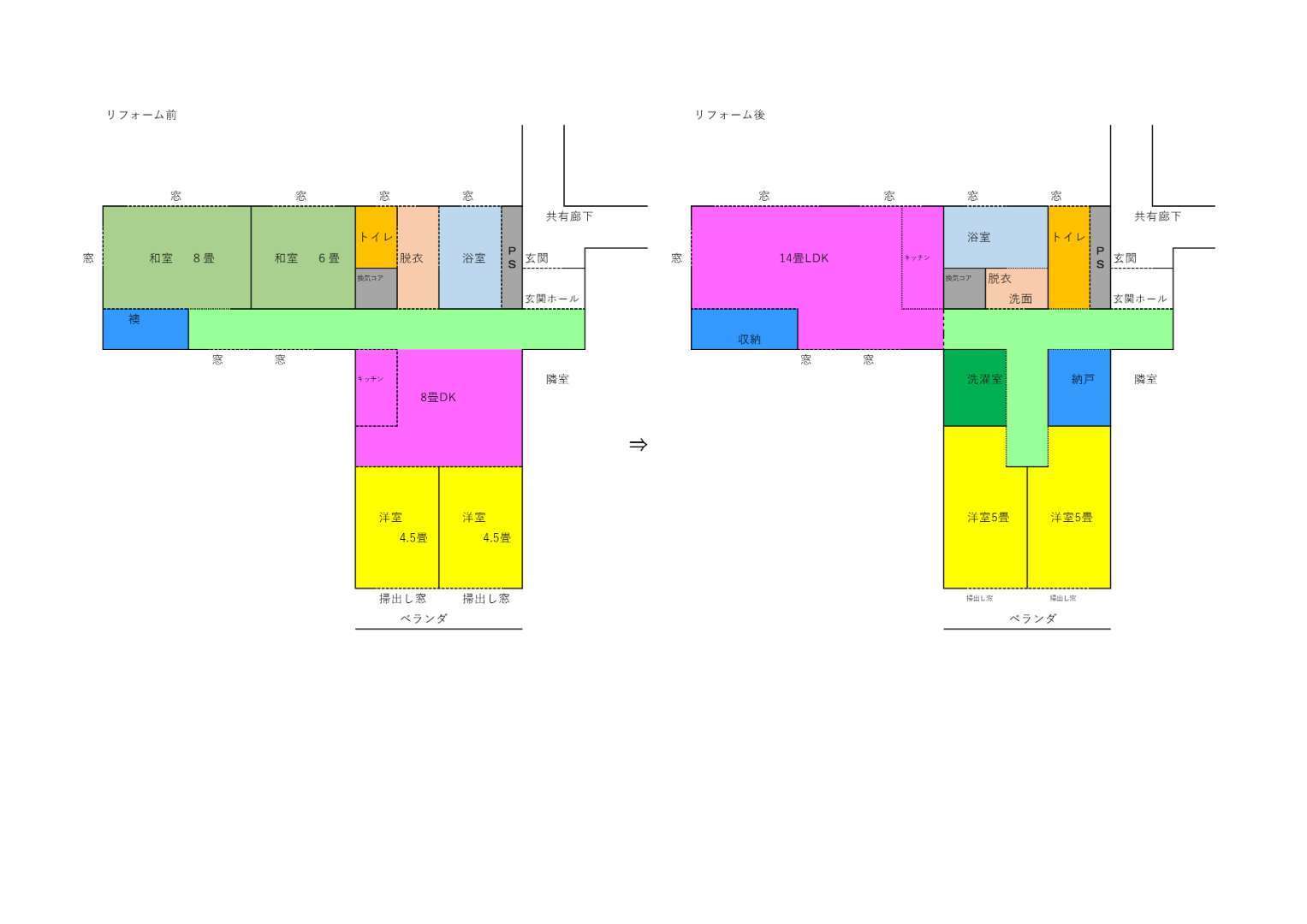 キッチンは共有の換気洞でその付近に限られるので旧和室、浴室等の裏側に持ってきて、2つの和室は1部屋にしてLDKとしました。水廻りはキッチンの壁反対側にユニットバスを持ってきて手前を脱衣スペースとしました。洗面化粧台はおけないので平鏡と壁付けボウルとしました。玄関横にトイレを配置して、直接得廊下からはいれるようにしました。