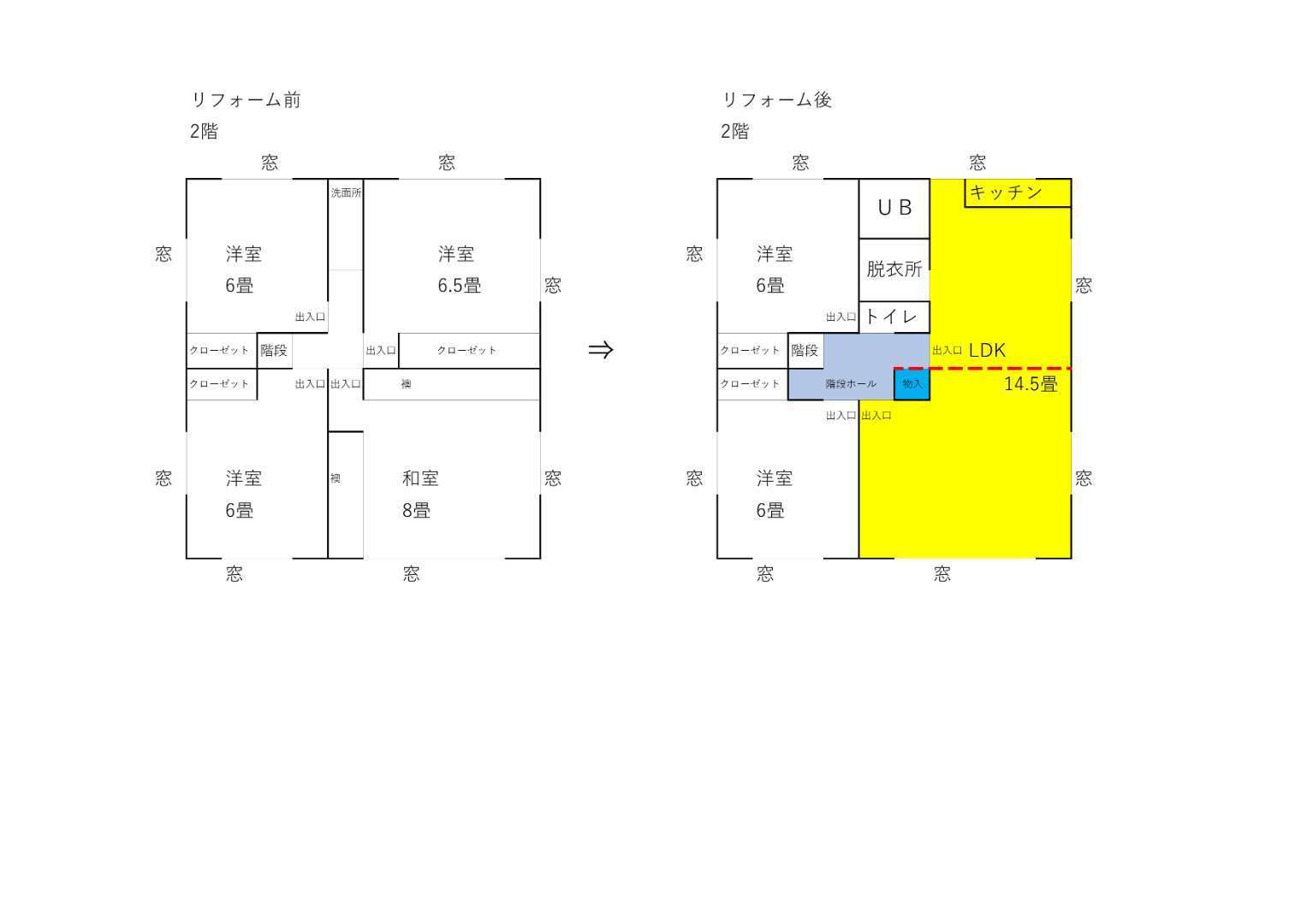 東側の6.5畳と8畳は1部屋にしてリビングにしたい。そこで境界になっている収納スペースを撤去するとそこは柱が隠されているので、それを撤去するために上を通る梁のせい(断面上下の寸法)を大きくして長いものに置き換えた。