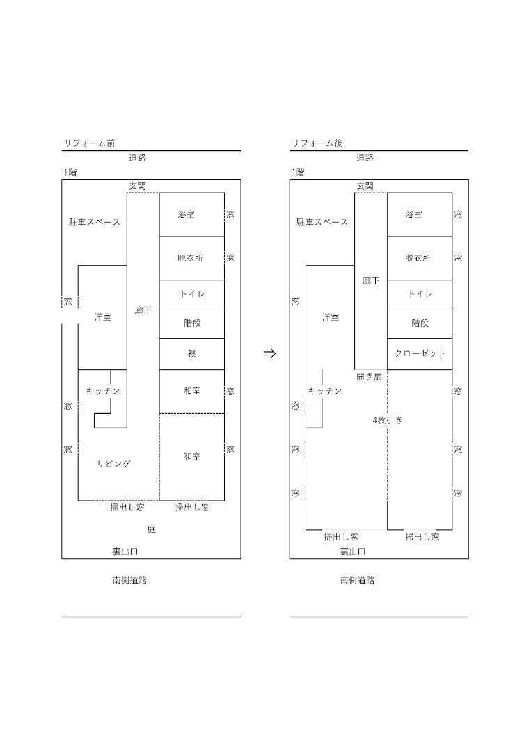改修個所は全てフローリング洋室となりました。できれば壁を取り払い一面でも使える部屋としたいとの要望もありましたので、柱撤去をしました。柱が無い分梁せいを、上げ、サポートを入れて施工を行い、梁型を天井に残す形で2階に影響を与えることなく接地をしました。部屋の区画は4枚引き引き違い扉にて区画し、最高28畳の部屋にできるように